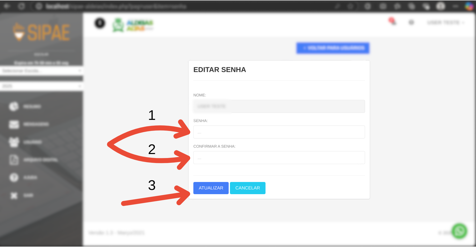 - Na página que será aberta ao executar um dos passos anteriores, preencha o campo com sua nova senha (1) e confirme a senha no campo seguinte (2). Depois, clique no botão 'ATUALIZAR SENHA' (3).