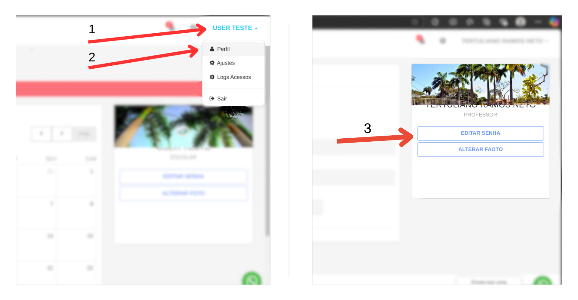 - Clique no seu nome de usuário (1) no canto superior direito, depois selecione "Perfil" (2) no menu que aparece e na página seguinte clique no botão "EDITAR SENHA" (3)