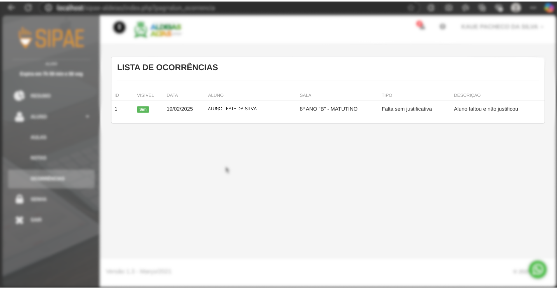 Ao entrar na página de ocorrência, é apresentado uma tabela com informações detalhadas das ocorrências registradas. A DATA indica quando a ocorrência foi registrada, enquanto a SALA informa a turma do aluno no momento. O TIPO classifica o ocorrido, como "Falta sem justificativa" ou "Bullying", e a DESCRIÇÃO traz mais detalhes sobre o que aconteceu.