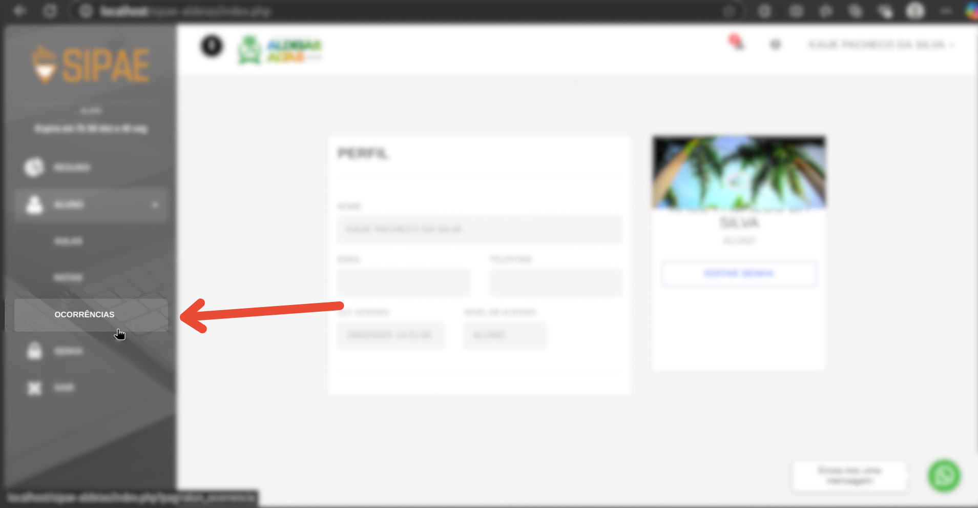 Ao acessar o sistema, clique na opção "OCORRÊNCIAS" no menu lateral.
